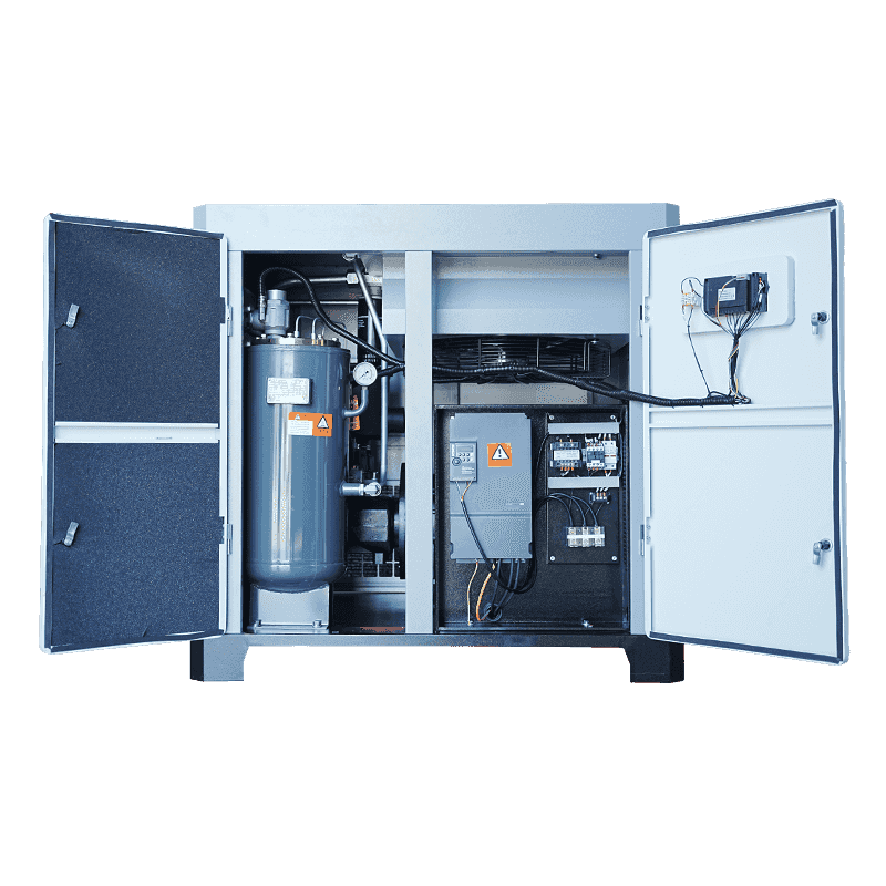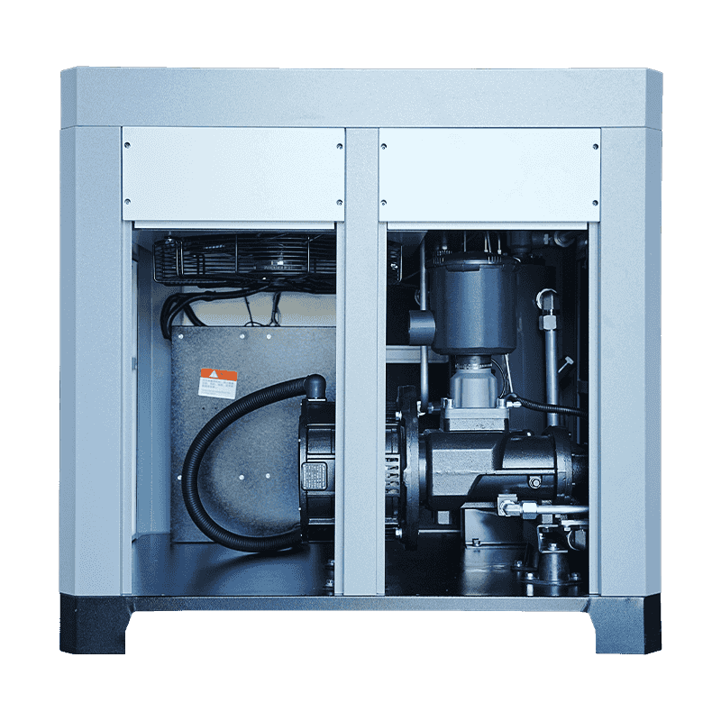 O sistema de compressão de parafuso duplo usado no modelo 50HP foi projetado para fornecer fluxo de ar contínuo com vazamento interno mínimo e saída de pressão consistente. Esta vantagem estrutural ajuda a manter a estabilidade energética durante operação prolongada. Comparado com unidades tradicionais de pistão ou multiestágio, o formato de parafuso duplo de estágio único permite que o compressor forneça o fluxo de ar necessário com mais eficiência. O processo de compressão interna estável ajuda a reduzir flutuações que podem aumentar o consumo. Durante longos períodos, esta estabilidade garante que o compressor desempenhe as suas tarefas sem aumentos desnecessários de potência, suportando uma utilização de energia previsível e controlada em ambientes exigentes.